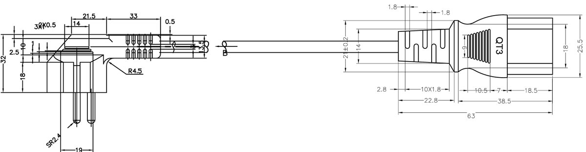 Korea Power Cords, KSC 8305 Plug to IEC 60320 C13 Connector, Type E,F, 3 poles Plug, KC Certified End Drawing (RoHS COMPLIANT)